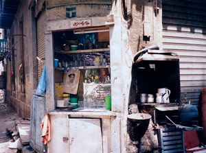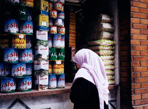 Woman at a market grocery stall - the tins are so large they might be oil....